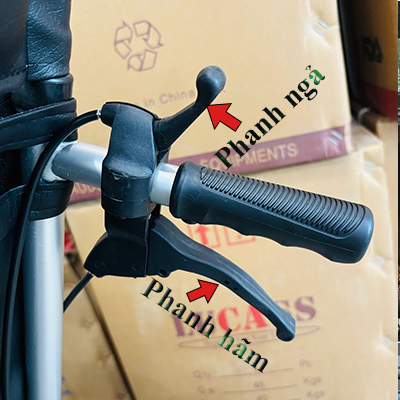 Hai bên tay đẩy có 2 hệ thống phanh: Phanh phía trên là phanh hạ ngả nằm hoặc dựng lên ngồi. Phanh phía dưới là phanh hãm bánh xe.