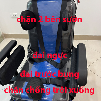 Do được thiết kế để dành cho trẻ bại não, không kiểm soát được hành vi nên xe có các điểm chắn giữ an toàn cho toàn bộ cơ thể gồm:
