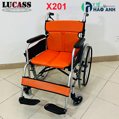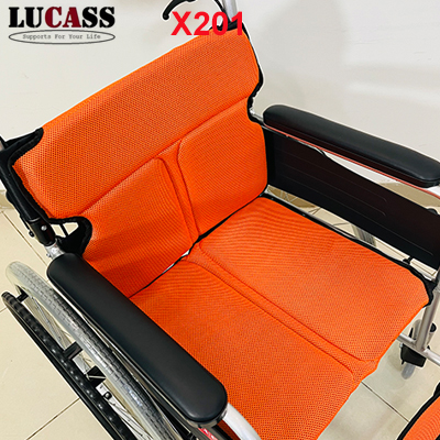 Xe lăn Lucass X201 có 2 phiên bản: Phiên bản thường và phiên bản nâng cấp. Phiên bản thường đệm ngồi và đệm tựa có 1 lớp màu đen. Phiên bản nâng cấp đệm ngồi và đệm tựa có 2 lớp, lớp dưới bằng vải màu đen, lớp trên tháo rời bằng vải lưới màu cam.