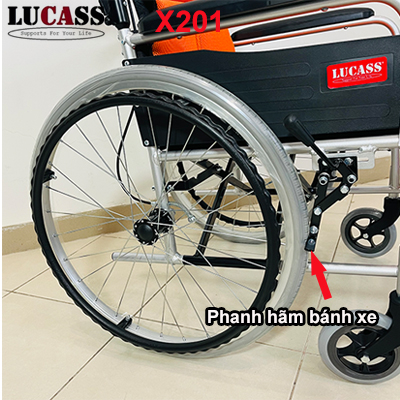 Hai bên bánh xe có phanh hãm, giúp cố định xe, giữ an toàn cho người ngồi mỗi khi lên xuống xe hoặc khi đỗ xe không di chuyển