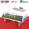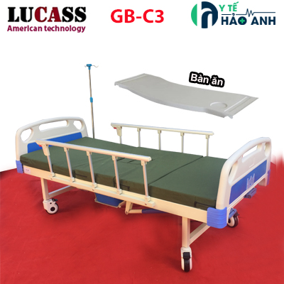 Trọn bộ giường y tế Lucass GB-C3 bao gồm: giường, đệm, lan can, cọc truyền dịch, bô vệ sinh, 2 tay quay, 1 cần gạt bô, bánh xe và bàn ăn.