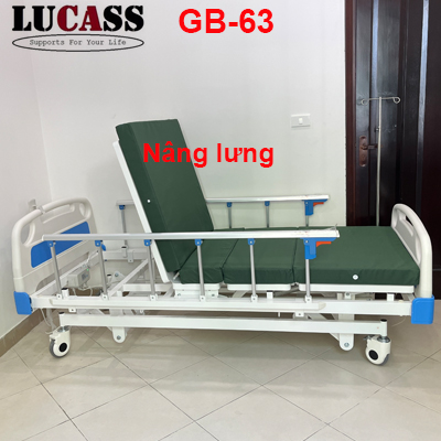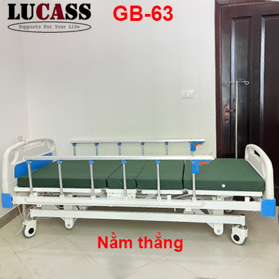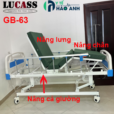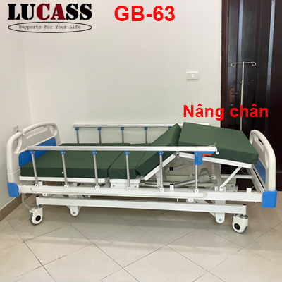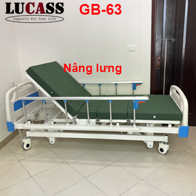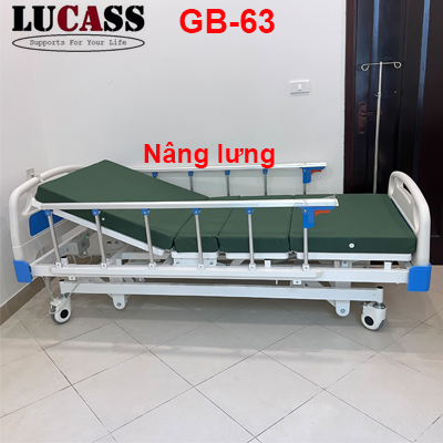 Nếu như giường bệnh nhân Lucass GB3 là giường có 3 chức năng được vận hành bằng tay quay thì giường bệnh Lucass GB-63 là giường 3 chức năng được thực hiện bằng các nút bấm của hệ thống điều khiển bằng điện. Nếu người bệnh tỉnh táo thì có thể tự điều khiển được, không cần người trợ giúp.