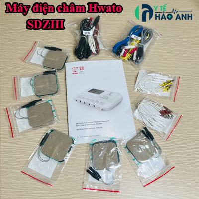 Trọn bộ sản phẩm máy điện châm Hoa Đà Hwato SDZ III bao gồm: 1 máy chính, 1 adapter để dùng điện, 6 bộ miếng dán, 6 dây nối, 6 bộ dây kẹp kim, sách hướng dẫn sử dụng, hộp đựng.