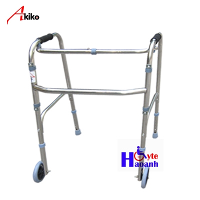 - Đặt khung tập đi lên phía trước, người ở phía sau, cách khung 1 bước chân. Dùng 2 tay nắm vào 2 bên thành khung , từ từ bước đi vào phía bên trong khung. Khi bước, dùng gót chân chạm đất trước, sau đó đến bàn chân và cuối cùng là các ngón chân, nâng các ngón chân lên. Hiện nay, khung tập đi được trang bị bánh xe phía trước, giúp người sử dụng đẩy khung tập đi rất nhẹ, 2 chân khung phía sau không có bánh xe nên không sợ trơn trượt