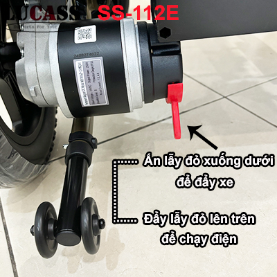 Dễ dàng chuyển đổi từ chạy điện sang đẩy xe khi hết điện hoặc xe gặp sự cố: Ấn 2 lẫy màu đỏ xuống phía dưới để đẩy xe. Nếu muốn chạy điện thì đẩy 2 lẫy màu đỏ lên phía trên