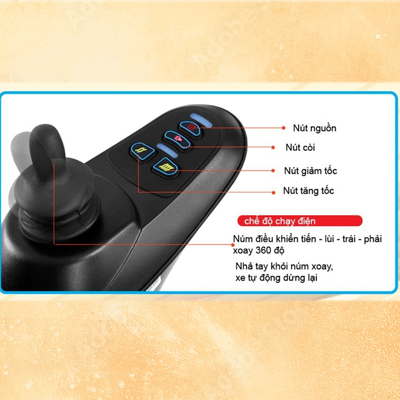 Bộ phận điều khiển gồm: Vạch báo pin, nút nguồn, còi, vạch báo tốc độ, nút tăng/giảm tốc độ và cần điều khiển. Có thể điều khiển tiến/lùi, sang phải, sang trái, xoay 360 độ.