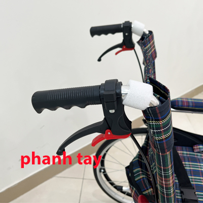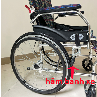 - Hai bên bánh xe lăn có 2 phanh hãm, giúp xe đứng yên không bị trôi khi không cần di chuyển. Phanh này người ngồi hoặc người đẩy đều có thể sử dụng được