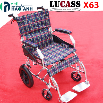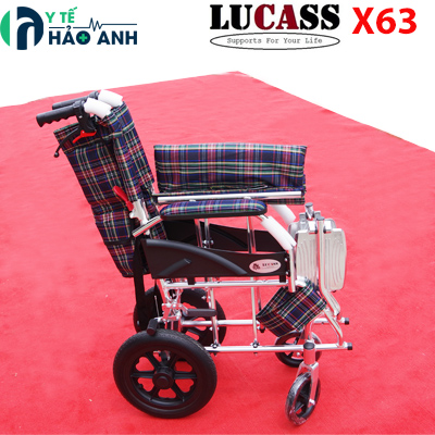 Xe lăn Lucass X63 bánh nhỏ dùng đi du lịch hoặc người ngồi không lăn tay được, cần có người đẩy.